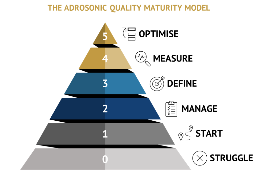 The ADROSONIC Quality Maturity Model provides a roadmap for clients at any point in their quality journey. The model comprises five maturity levels of quality, depicting the transition from an ad-hoc approach to a data-driven, optimised approach.