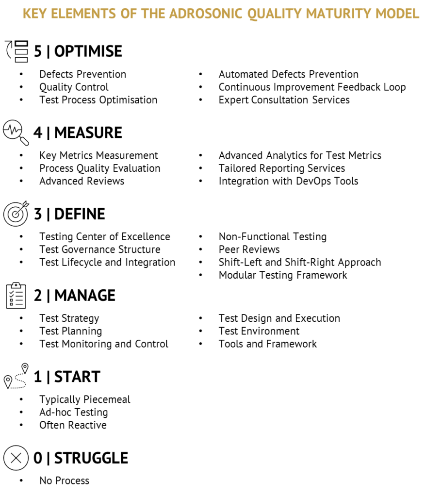 The ADROSONIC Quality Maturity Model is the leading framework for ensuring the highest standards of quality for businesses in every step of the software development life cycle. Our team of seasoned experts developed the ADROSONIC Quality Maturity Model, drawn from a decade of extensive global customer experience combined with industry best practices, including CMMI (Capability Maturity Model Integration) and TMMI (Test Maturity Model Integration).