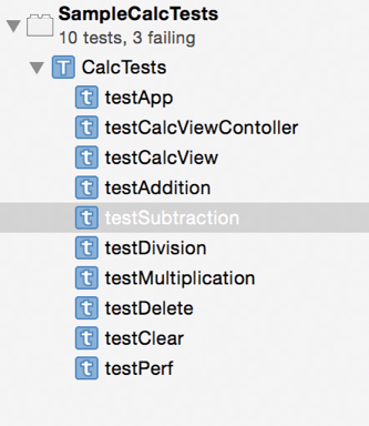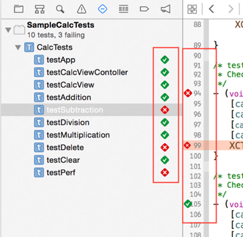 Click on a test in the list in order to access its code in the source editor. Test indicators: Indicators appear next to the test names in the test navigator when tests have been run. A green diamond shape with a check mark indicates that a test has passed, and a red diamond shape with an “X” indicates that a test has failed. When the code for tests is visible in the source editor, the same indicators that have been discussed appear in the source editor gutter.