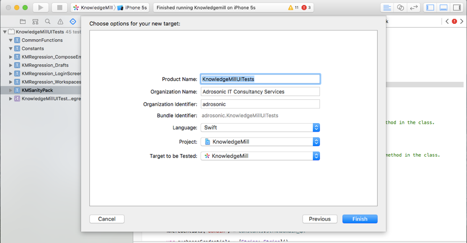 In order to start automating your app, you’ll first need to add that app as a UI target. This will connect your app configurations with XCTest so that you can run tests on the associated target. It will add the basic setUp, tearDown, and test methods for you to start writing your tests there. You’ll have to enter some basic details of the app in the following pop-up after you click on it to add a target: