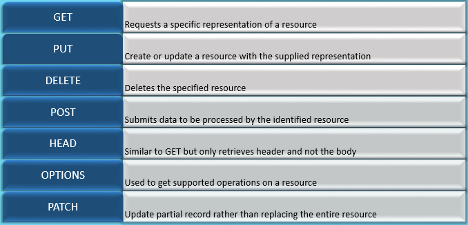 Resources are manipulated using a fixed set CRUD (Create, Read, Update and Delete) operations. This is achieved using sets of HTTP methods. Followings are well known HTTP methods are commonly used in REST based architecture.